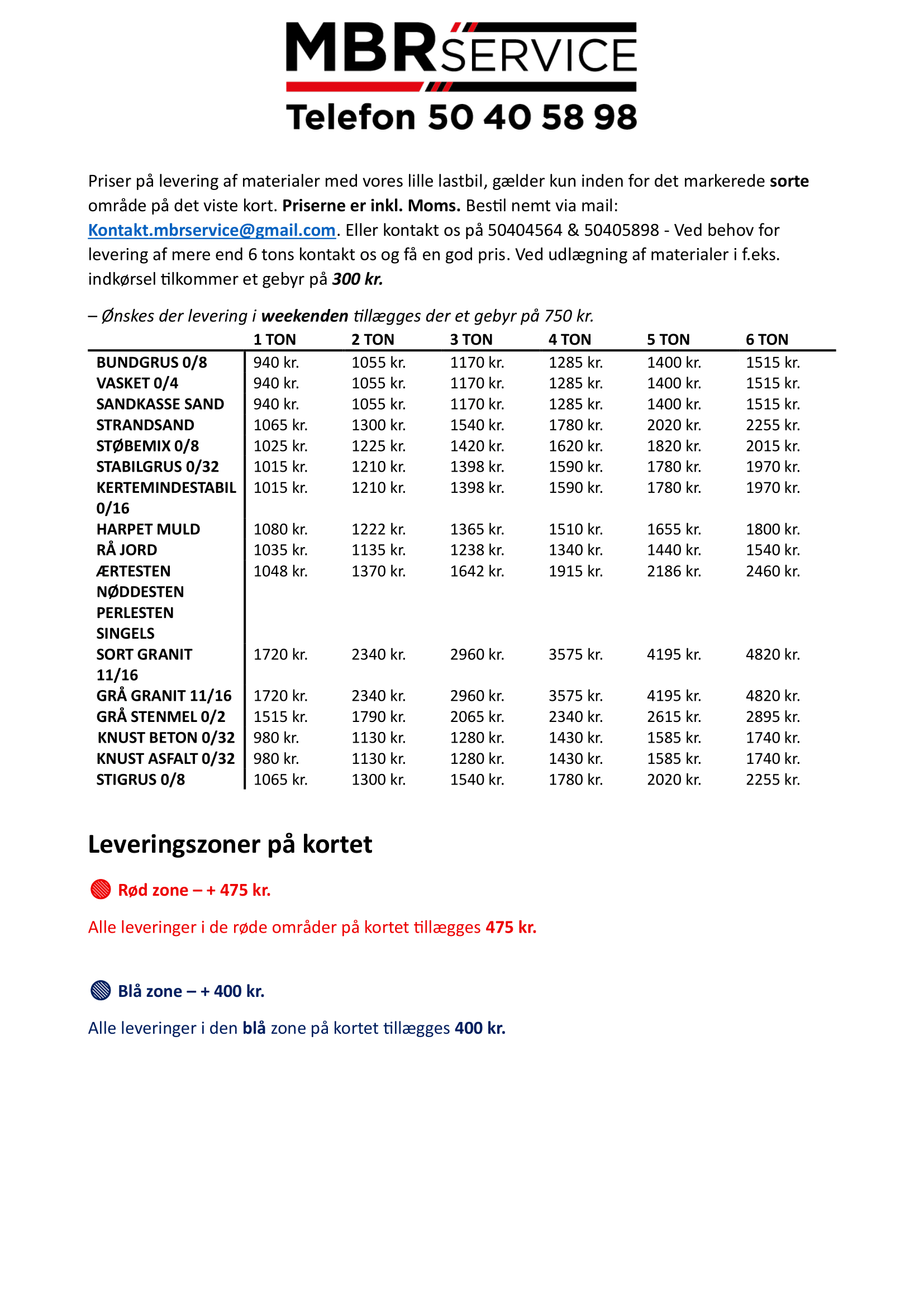 Prisen afhænger af leveringszonen og materialetype. Du kan nemt hente vores opdaterede prisliste ved at klikke nedenfor. Alle de oplyste priser er INKL. LEVERING - for leveringer over 6 ton kontakt os og få en god pris.