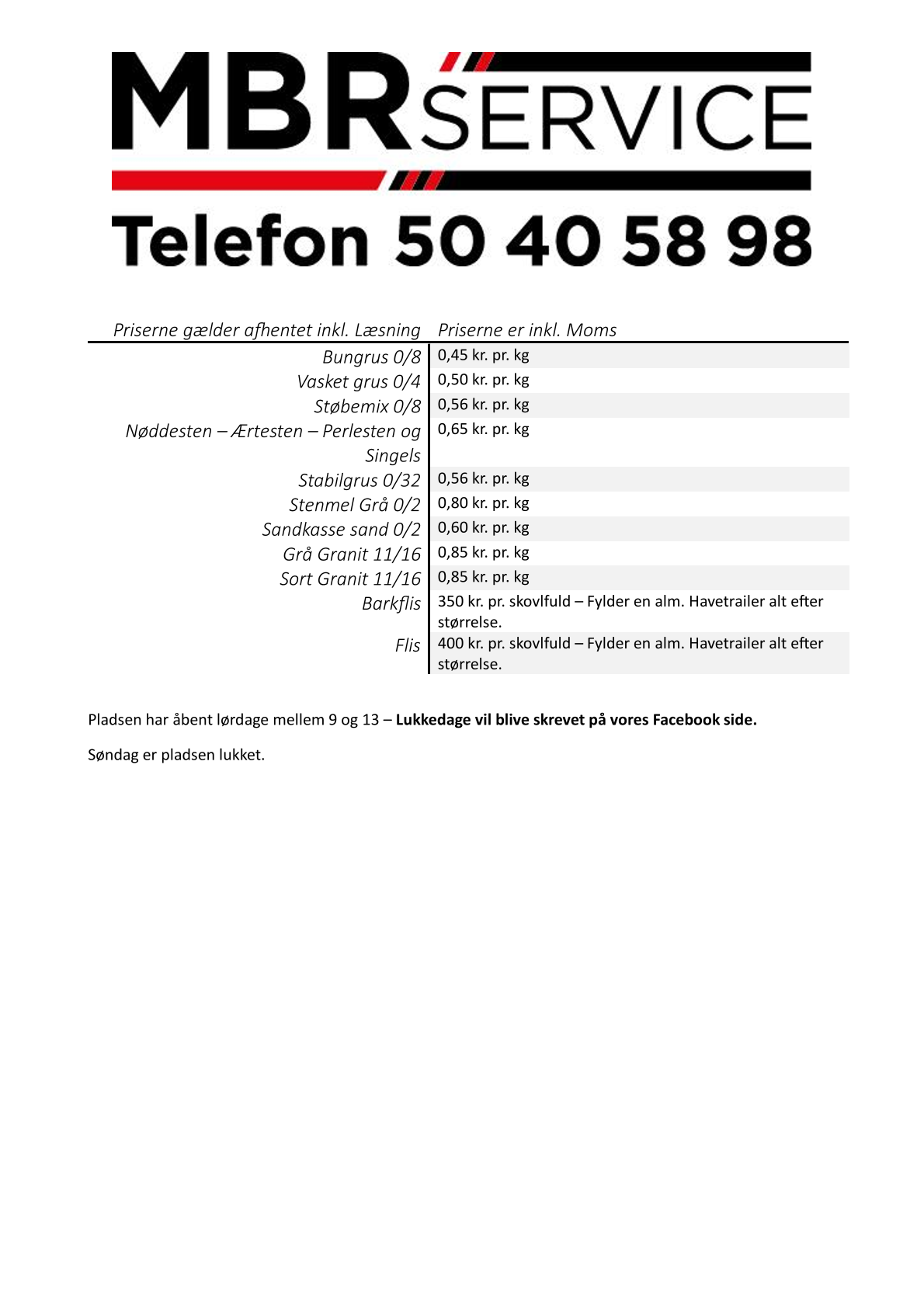 MBR Service har de skapeste priser på Sten, Grus, Granitskærver, muldjord, støbemix mv. Vi læsser din trailer med maskine, så ingen håndlæsning her. Vi har ikke faste åbningstider, man ringer og aftaler et tidspunkt. Alle Søndage har pladsen lukket.